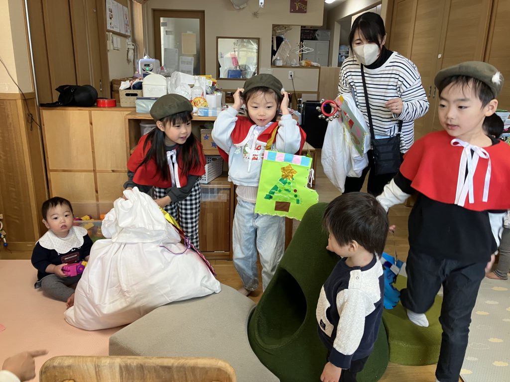 クリスマスの日、サンタクロースに変身した新生保育園ヨセフ組のお兄さん、お姉さんたちがプレゼントを持ってきてくれました🎁✨