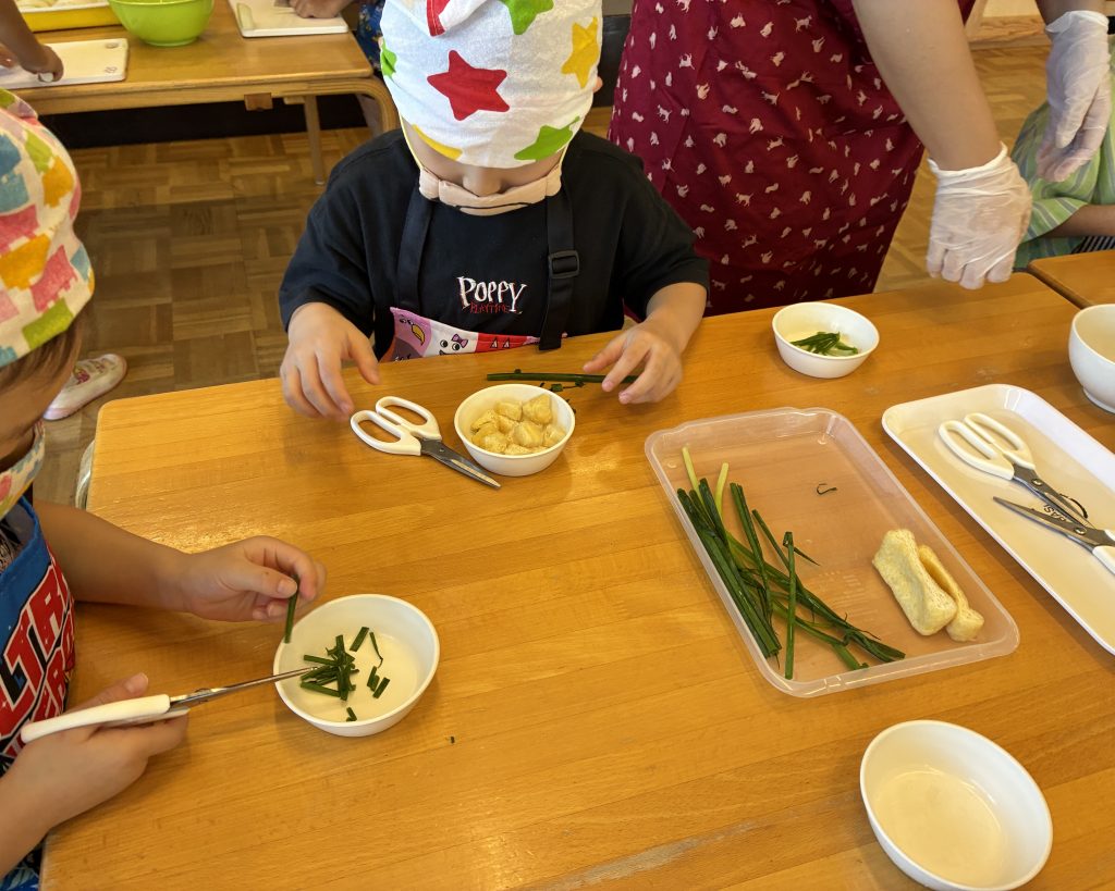 お汁の中に入れる油揚げ、小ネギをハサミを使って子どもたちが切りました✂️