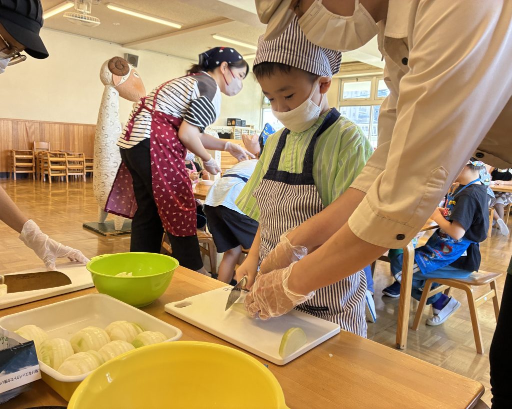 今回のキッズキッチンでは初めて包丁を使って玉ねぎを切り、