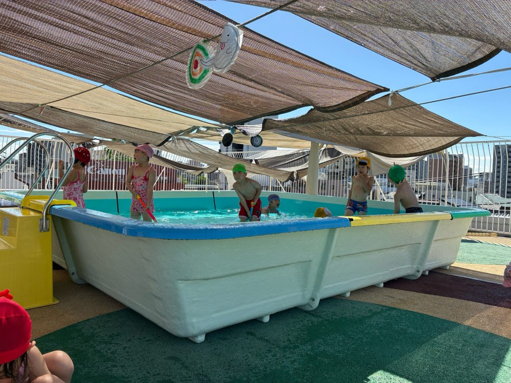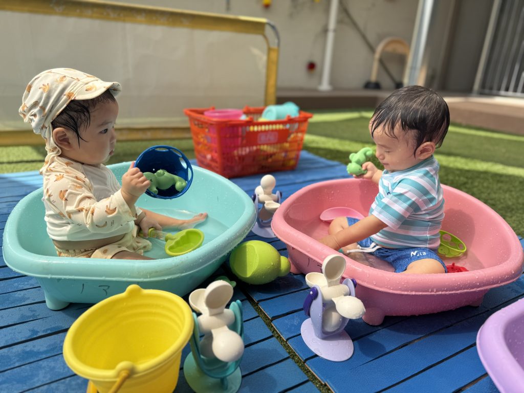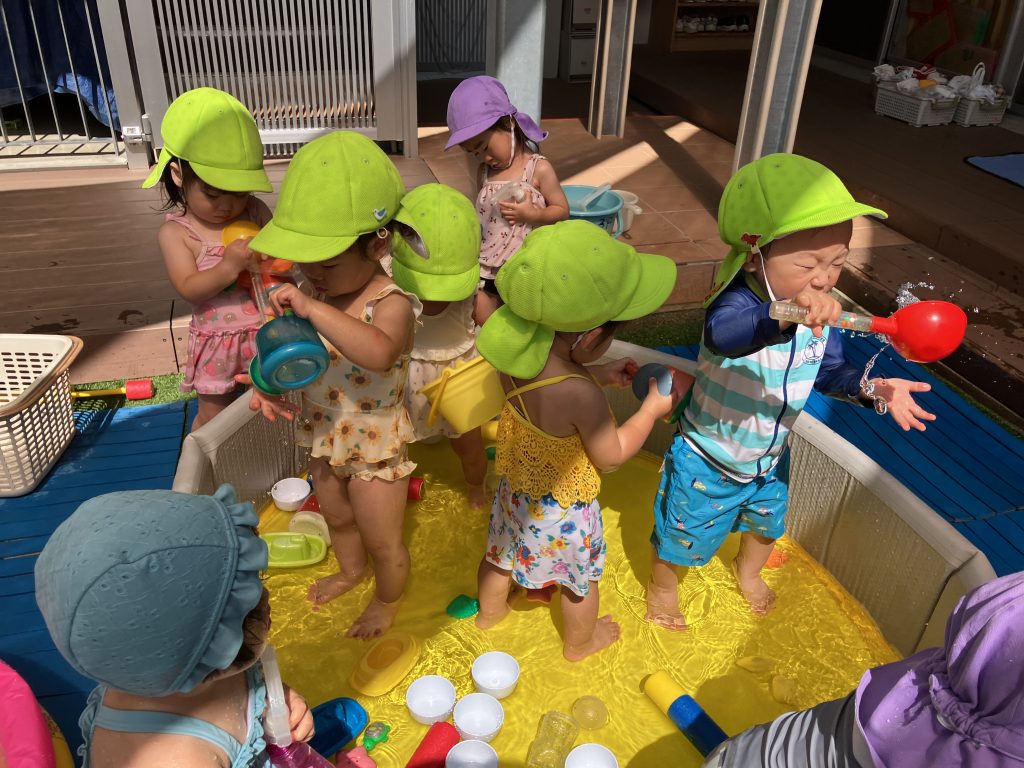 今年も暑い夏となりましたが、子どもたちは毎日元気いっぱいで水遊びを楽しんでいました。0歳児クラスの子は保育園では初めての水遊びとなり、ドキドキしている様子も見られましたが、少しずつ水に慣れていくことができました。