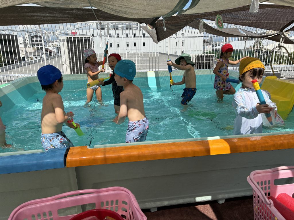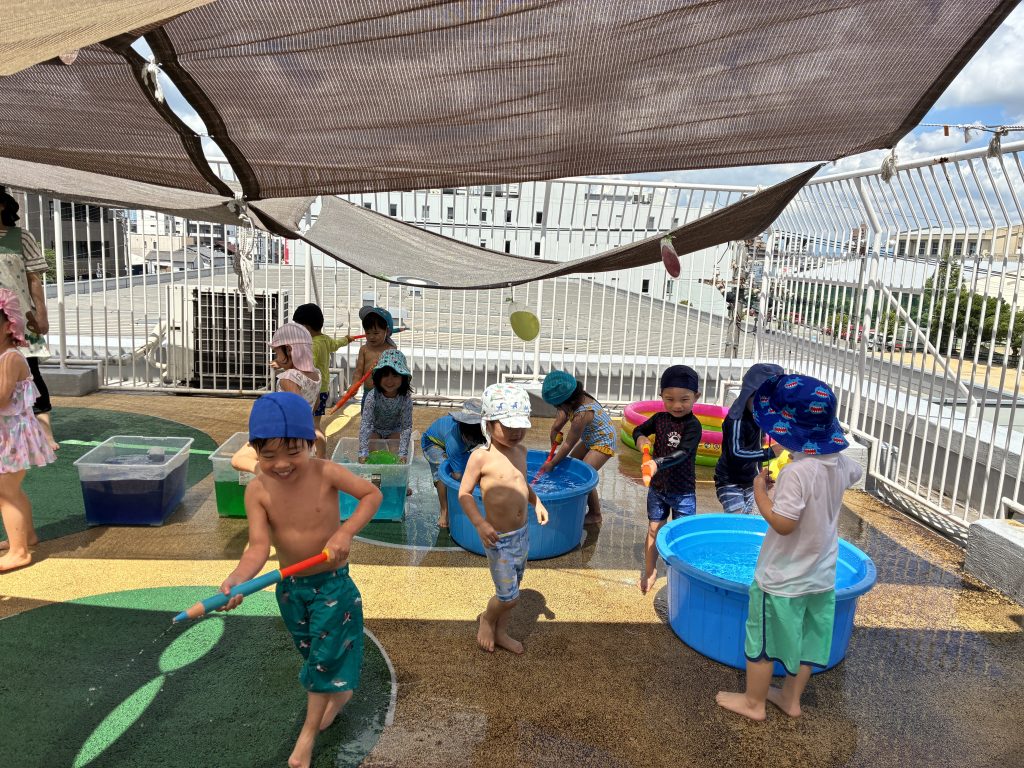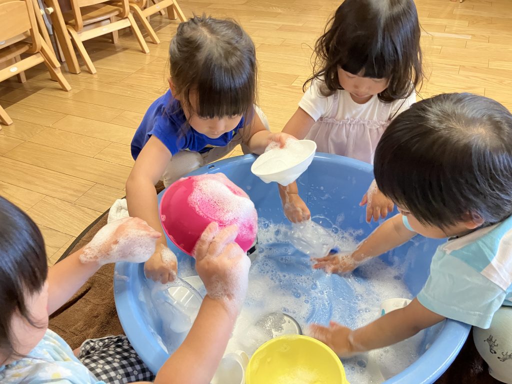 幼児クラスは屋上の広い場所での水遊び。友だちと水鉄砲を使ったりしながら全身で夏の遊びを楽しみました。気温が高い日も続いたので、お部屋で【氷・泡・寒天】なども使って感触遊びを経験することもできました。