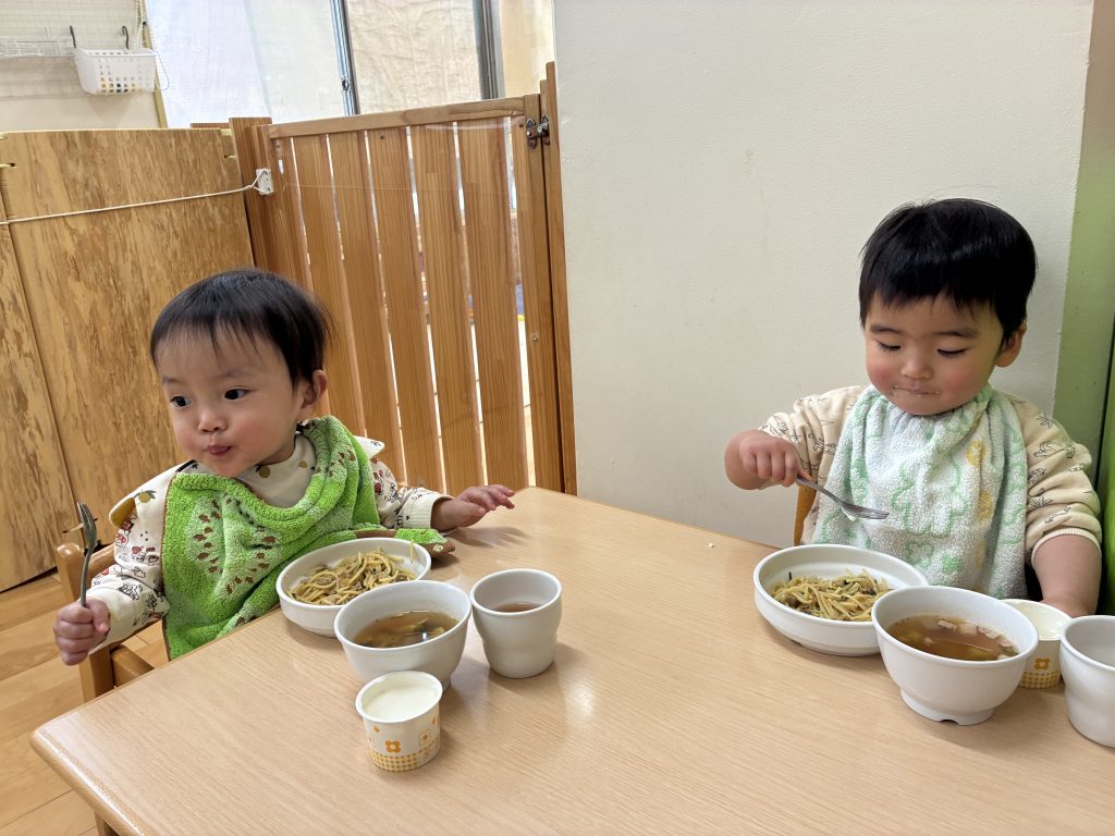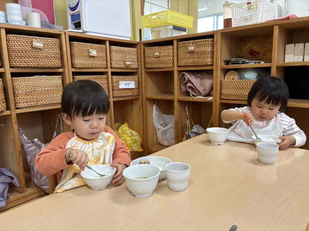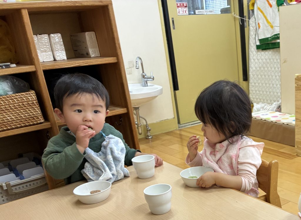 手づかみで食べられる野菜スティックやおやつは、手で掴み感触を確かめながら食べています。「おいしいね」と声をかけながら、子ども達も隣のお友だちと目を合わせ楽しい雰囲気の中で食事をしています。