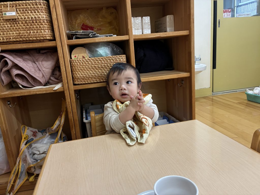 給食が大好きな0歳児ひよこ組。ミルクや離乳食初期からスタートした子ども達も、後期食、完了食へと移行していき、スプーンを自分で持ち意欲的に食べれるようになりました。