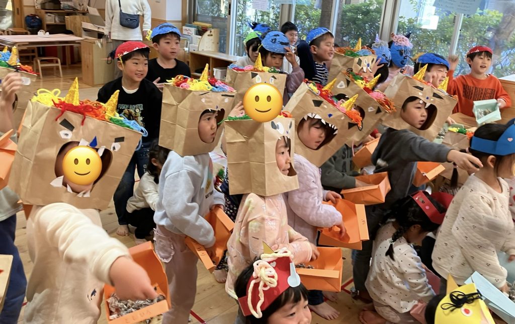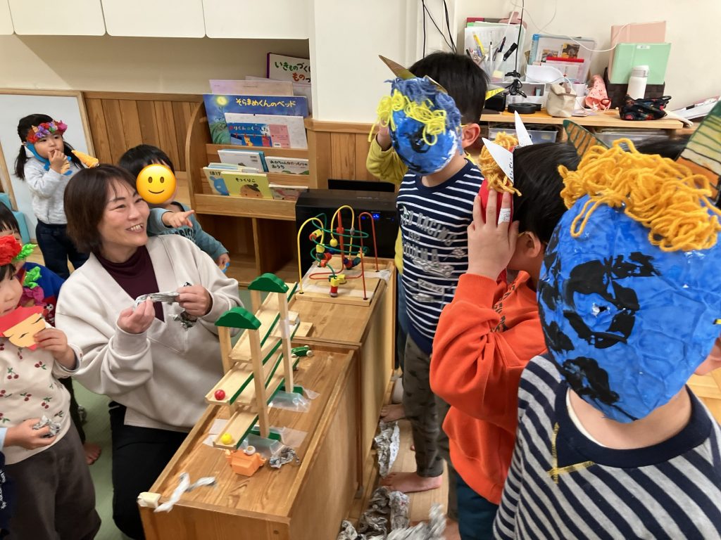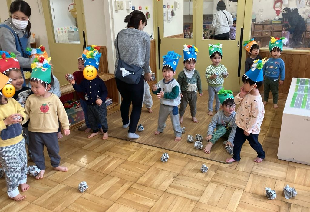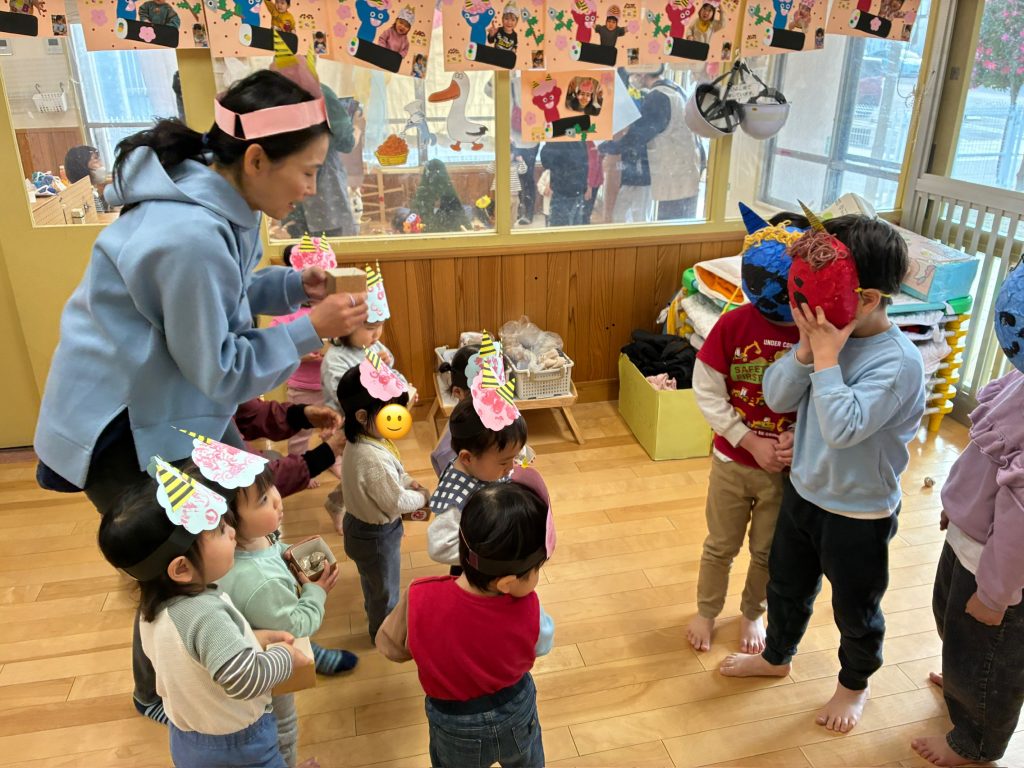 乳児組は年長組が自分で作ったお面をかぶって鬼役をやり、無理なく参加していました。元気に新聞紙豆を投げたり、びっくりしてじっと見ていたりする姿が見られました。年長組は恥ずかしかったのか優しい鬼さんでした。