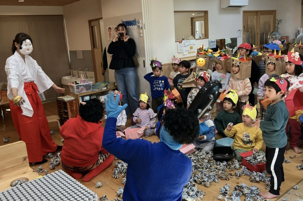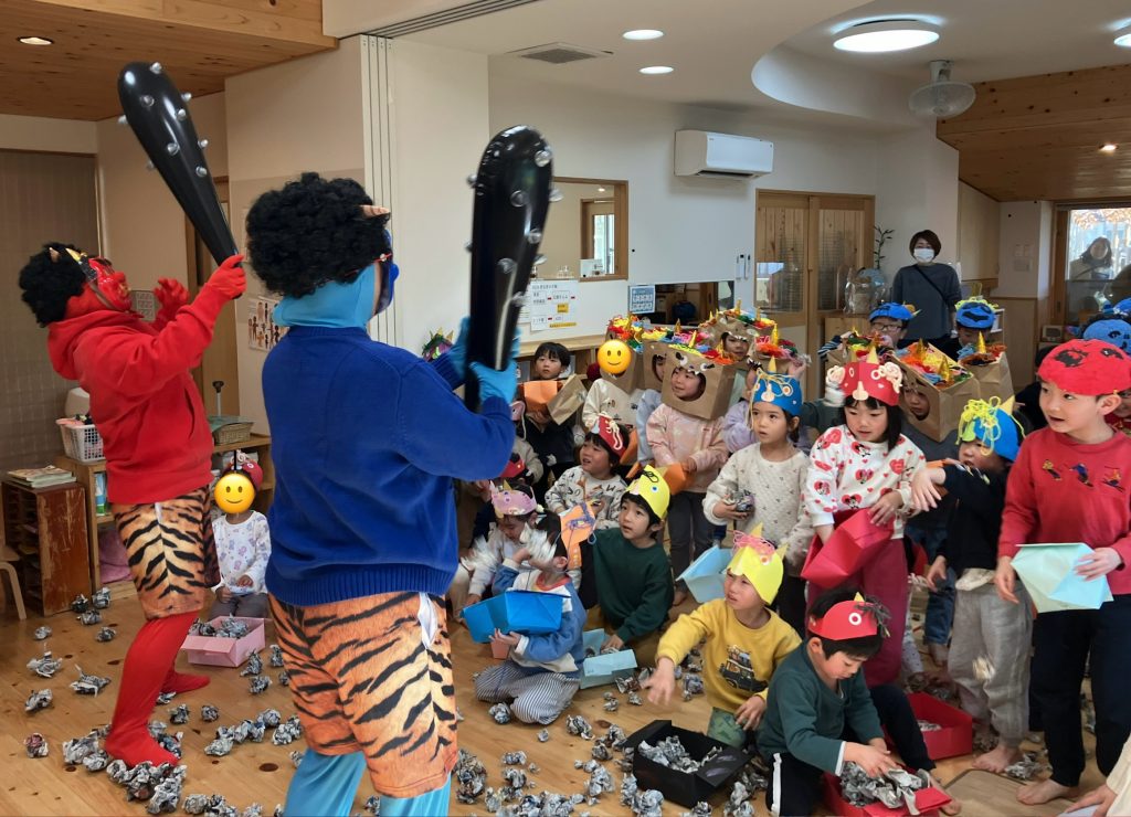 幼児組は赤鬼と青鬼が登場!びっくりしながらも必死に新聞紙豆を鬼に投げていました。最後は福の神が出てきて子どもたちと鬼は仲直り。