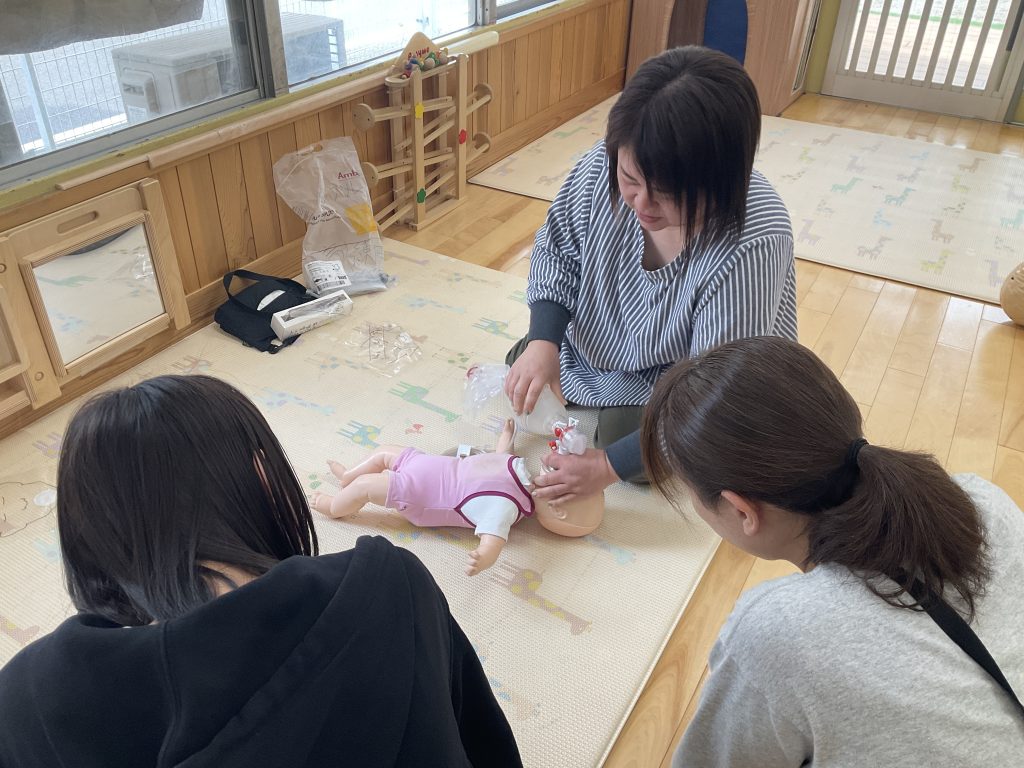 毎年この時期は、全職員対象に心配蘇生と窒息の解除を中心とした園内研修をしています。看護師による講義と訓練用人形やAEDデモ機を使った演習を行いました。さらに、緊急時の動きや優先順位なども再確認しました。次回は実際の保育中にSIDSを想定した訓練を行います。