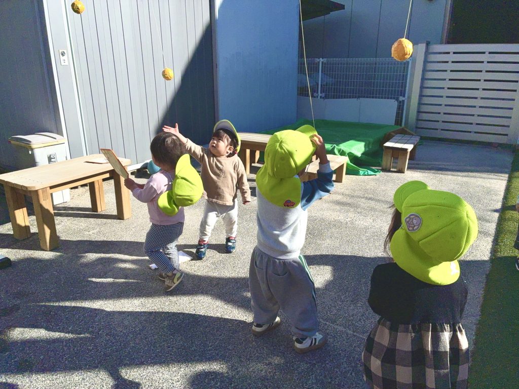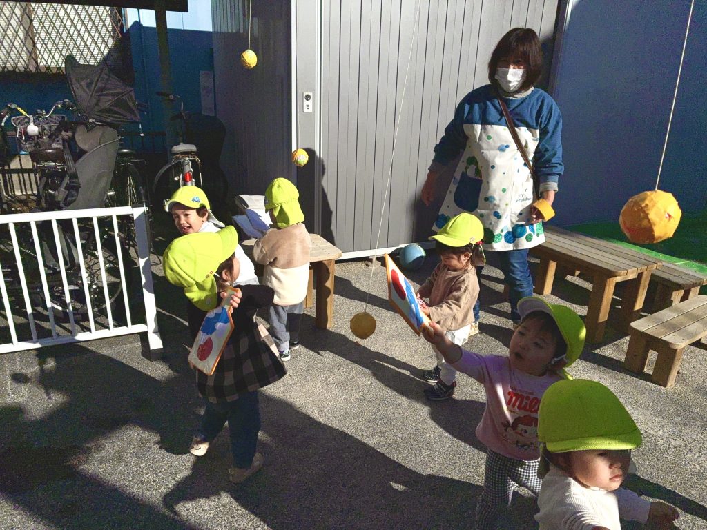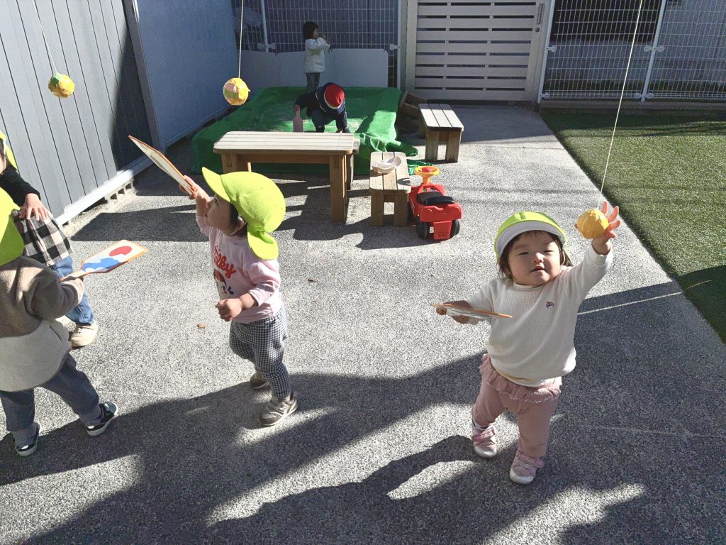 初めはやり方が分からなかったり、なかなか当たらなかったりしていた子も、友だちと一緒に何度も挑戦しながら遊ぶ中でわかるようになり、今では上手に球に板を当てることができています!