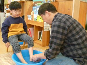 イエス様が十字架につく前にお弟子さんの足を洗ってくれたことに倣い、牧師が卒園するヨセフ組の子ども達一人ひとりの足を心を込めて洗ってくれました。小学校でもたくさん友達をつくり元気に楽しく生活してほしいです。卒園おめでとうございます。